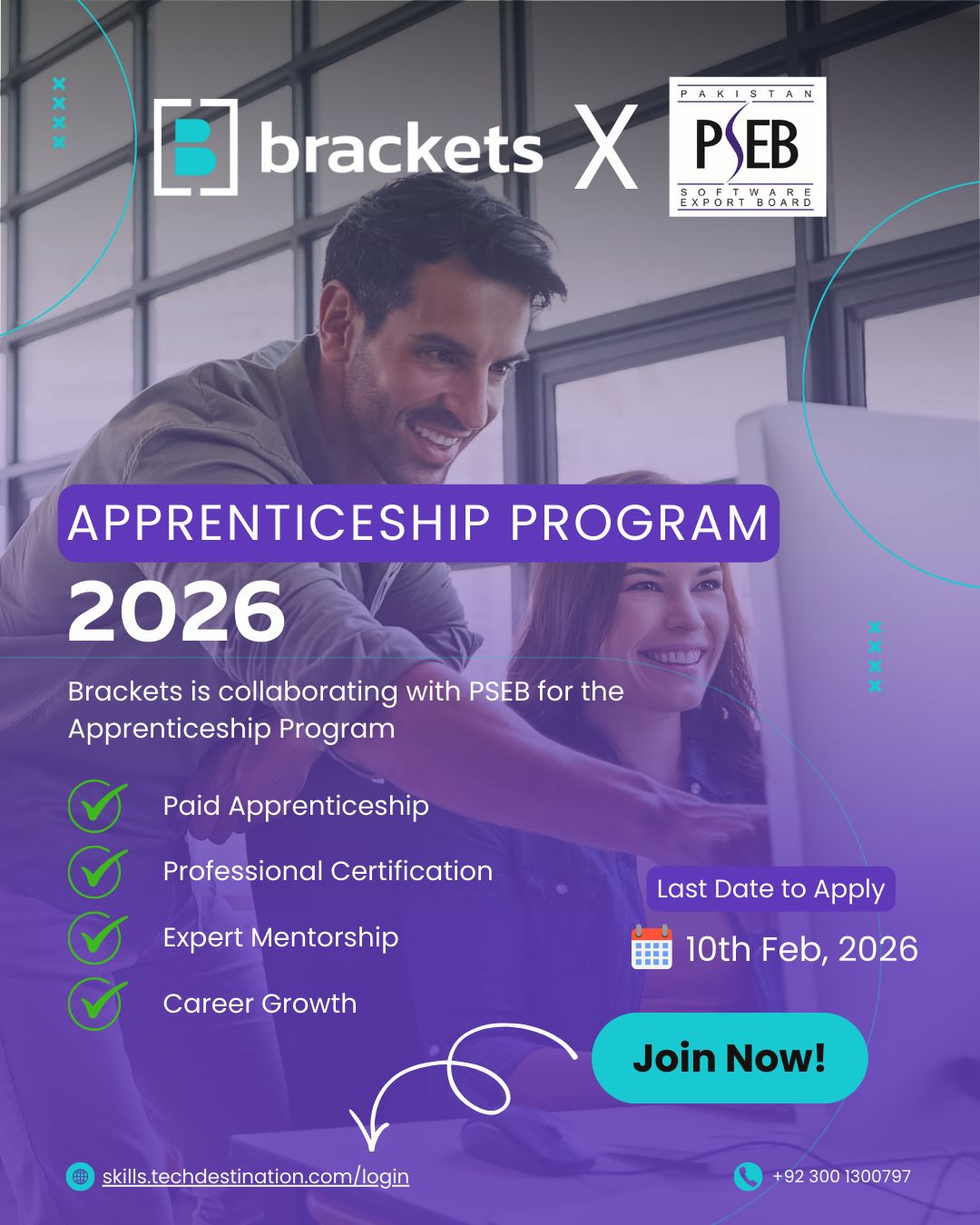 Brackets, in collaboration with the Pakistan Software Export Board (PSEB), is proud to launch the 2026 Apprenticeship Program, a career-focused initiative designed to bridge the gap between academic learning and real-world professional expertise. This program is tailored for fresh graduates and emerging professionals who are ready to step confidently into the technology and export-driven digital economy of Pakistan.