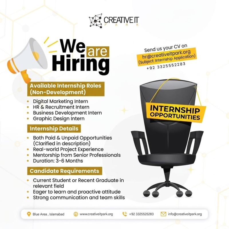 Are you a student or fresh graduate looking to gain practical experience and build a strong career foundation? Creative IT Park is offering exciting internship opportunities in Islamabad for individuals who want to develop professional skills in non-technical domains. This program is ideal for those aiming to gain real-world exposure, work in a collaborative environment, and learn directly from industry experts.