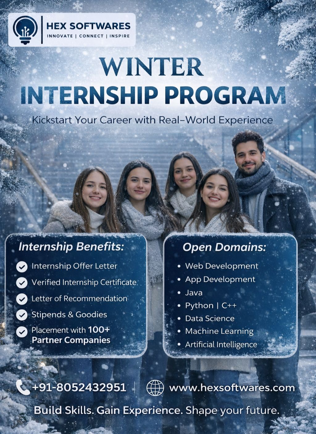 Hex Softwares is committed to nurturing future talent by providing a dynamic learning environment where interns collaborate with experienced mentors and industry specialists. Whether you aim to become a software developer, data scientist, AI engineer, or UI/UX designer, this internship gives you the opportunity to apply theoretical knowledge to real challenges and build a strong professional portfolio.