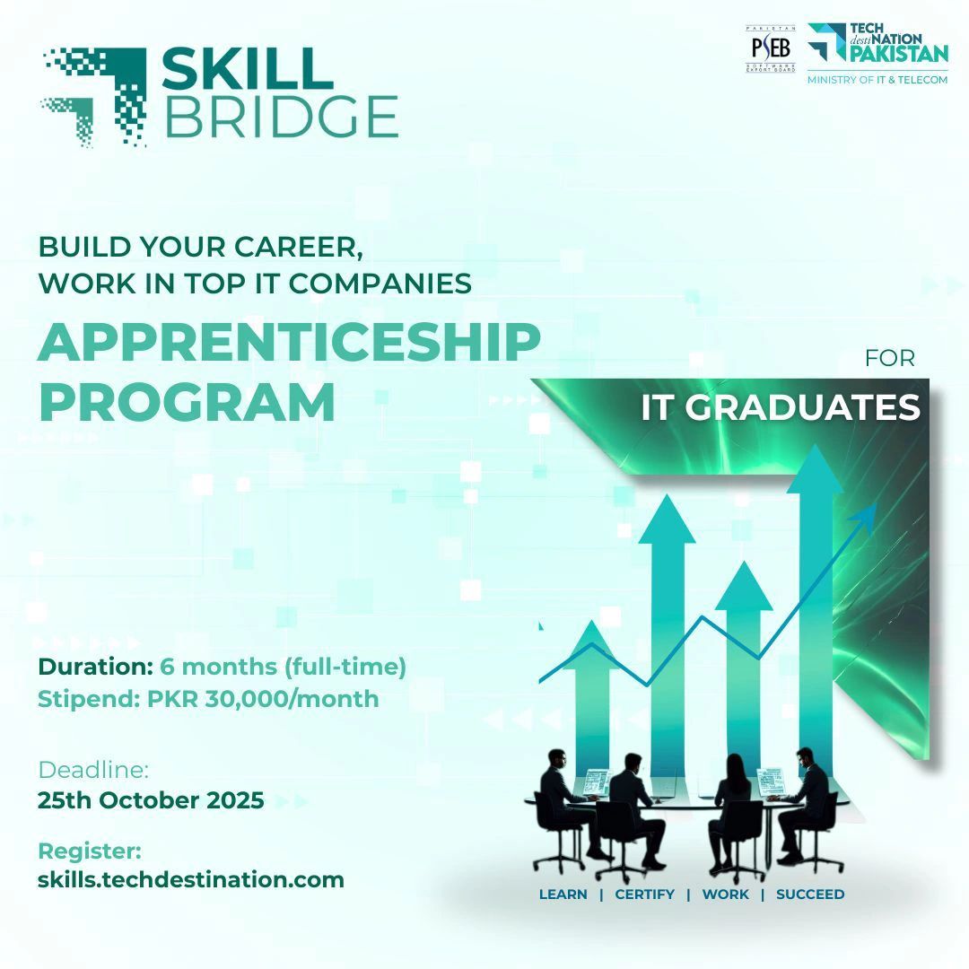 The Pakistan Software Export Board (PSEB), under the Ministry of Information Technology & Telecommunication (MoITT), proudly announces the Skill Bridge Apprenticeship Program 2025 — a landmark initiative designed to bridge the gap between education and employment in Pakistan’s ever-growing IT industry.