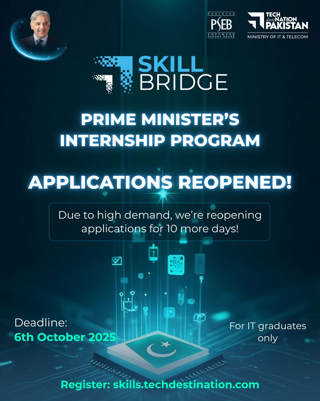 The Pakistan Software Export Board (PSEB) has officially reopened applications for the highly sought-after Prime Minister’s Internship Program 2025 under the SkillBridge Program, part of the Prime Minister’s SkillTech Pakistan initiative.