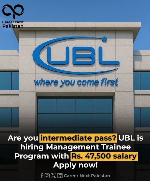 Career Next Pakistan is excited to share an excellent job opportunity at UBL (United Bank Limited), one of Pakistan’s most reputable and well-established banking institutions. UBL is currently hiring fresh intermediate graduates for its Management Trainee Program, offering a strong entry point into the banking and financial services industry.